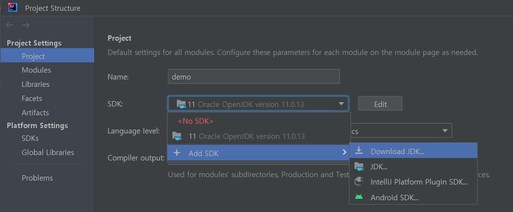 - 아래 사진에서 Add SDK 클릭 이후 Download JDK를 선택하면 여러 버전의 jdk를 설치할 수 있음