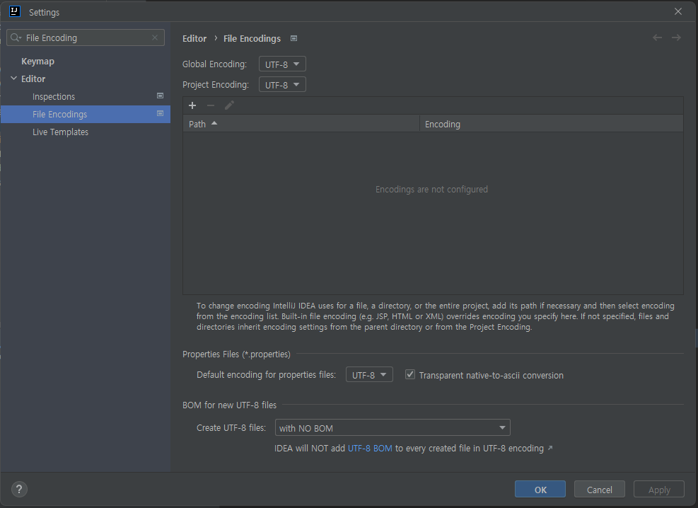 File Encdoing 검색 후 Global Encoding, Project Encoding, Properties Files를 UTF-8로 변경 & Properties Files의 Transparent native-to-ascii conversion 체크