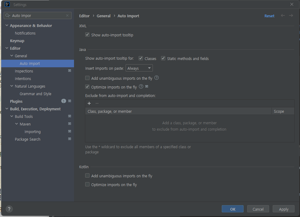 Auto Import 검색 후 Optimize imports on the fly 활성화