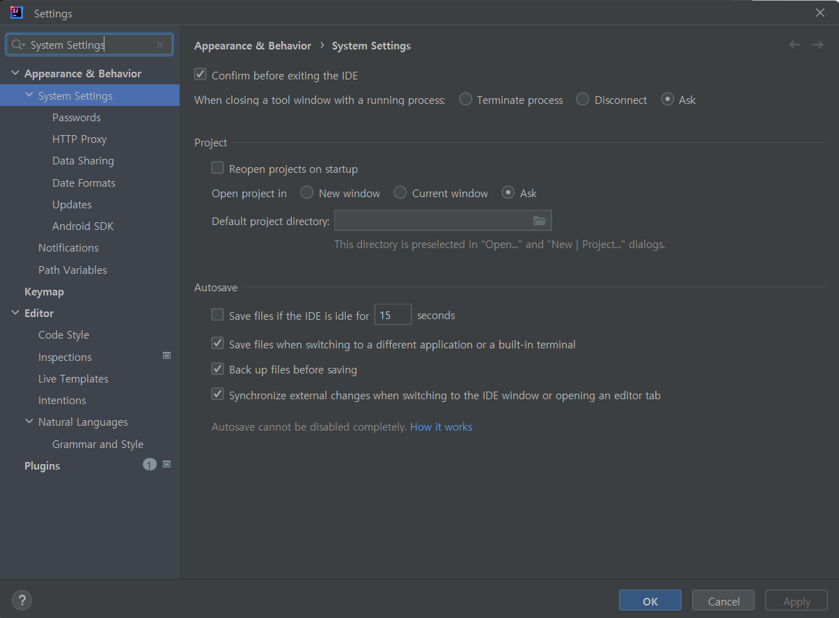 IntelliJ는 1개의 Project당 설정을 따로 줄 수 있는데, 내가 원하는 프로젝트마다 아래 설정을 해줘야 제대로 적용 될 것이다.
