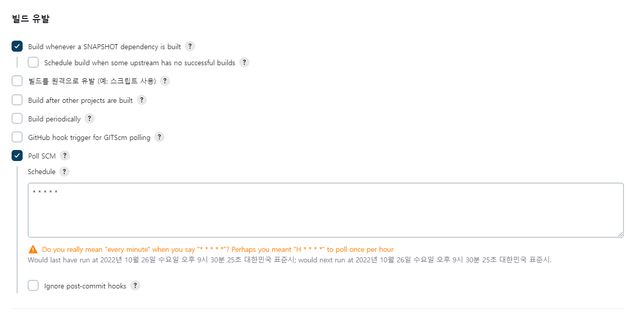 6. 빌드 유발 > Poll SCM 선택 & Schedule : * * * * *로 지정
