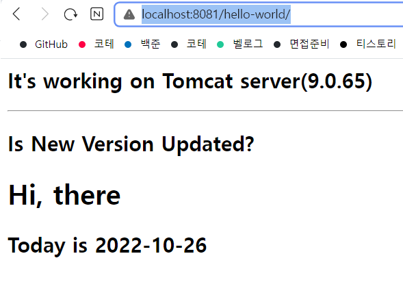 성공적으로 Jenkins에서 Build 과정이 수행되었다. 마지막으로 localhost:8081/hello-world에 접속하여 우리가 만든 변경사항이 실제로 적용되었는지 확인해보자.