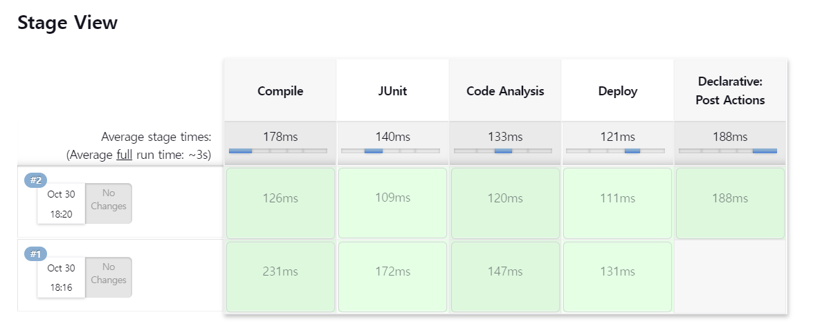 Stage View에서 Pipeline의 각 단계(Stage)를 처리하는 데 걸린 시간을 시각화해준다.