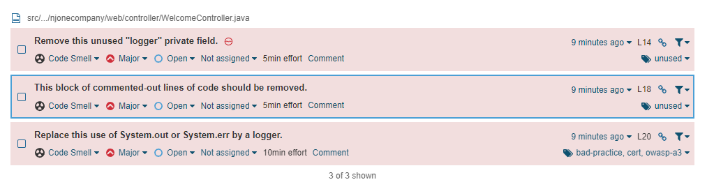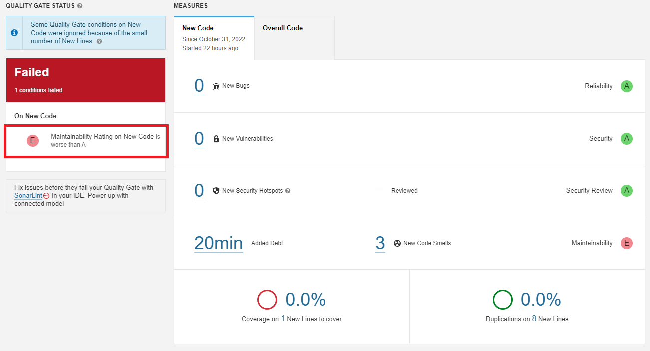 Failed 된 프로젝트를 선택하면 위와 같은 창이 뜬다. SonarQube는 이 코드가 3개의 Code Smell이 존재하고 있다고 판단했다.