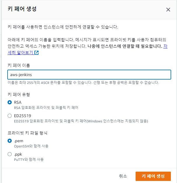 키 페어 이름은 Key 용도를 쉽게 구분할 수 있도록 설정하며 키 페어 유형 및 프라이빗 키 파일 형식은 별다른 제한이 없으나 생성한 키 파일은 잘 관리해야 한다는 것을 기억해두자.