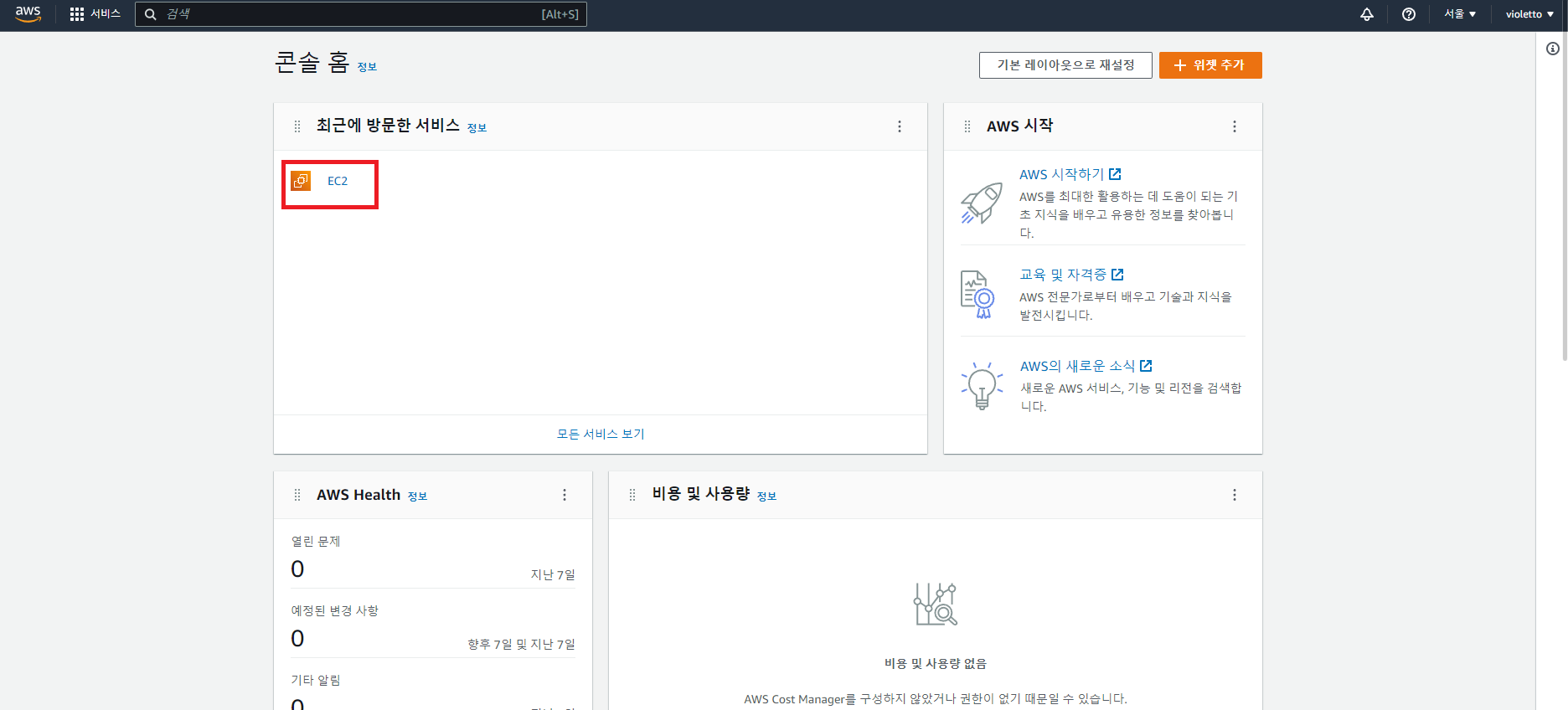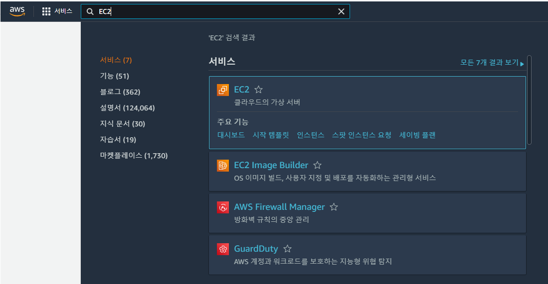 EC2를 이미 사용했었다면 위 사진처럼 최근 방문한 서비스로 접속할 수도 있고 검색 창에 EC2를 입력하여 서비스를 사용할 수 있다.
