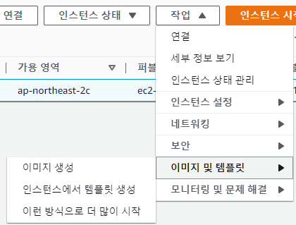 1. 복제하고 싶은 Instance 선택 > 작업 > 이미지 및 템플릿 > 이미지 생성 클릭