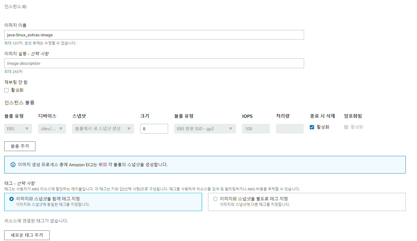 그래서 마치 Docker Image처럼 이미 자바와 Amazon Linux Extras가 설치되어 있는 환경을 이미지화시켜 생성한 이미지를 통해 기존에 존재하는 Instance를 그대로 복사한 것과 같은 AWS Instance를 여러 개 만들 수 있다.