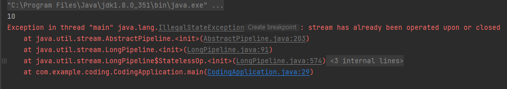 실제로 첫 번째 stream.count() 명령은 정상적으로 원소 개수인 10을 반환했지만, 두 번째 stream.count()는 "stream has already been operated upon or closed"라는 Stream이 이미 닫혔다는 에러를 발생시키는 것을 볼 수 있다.