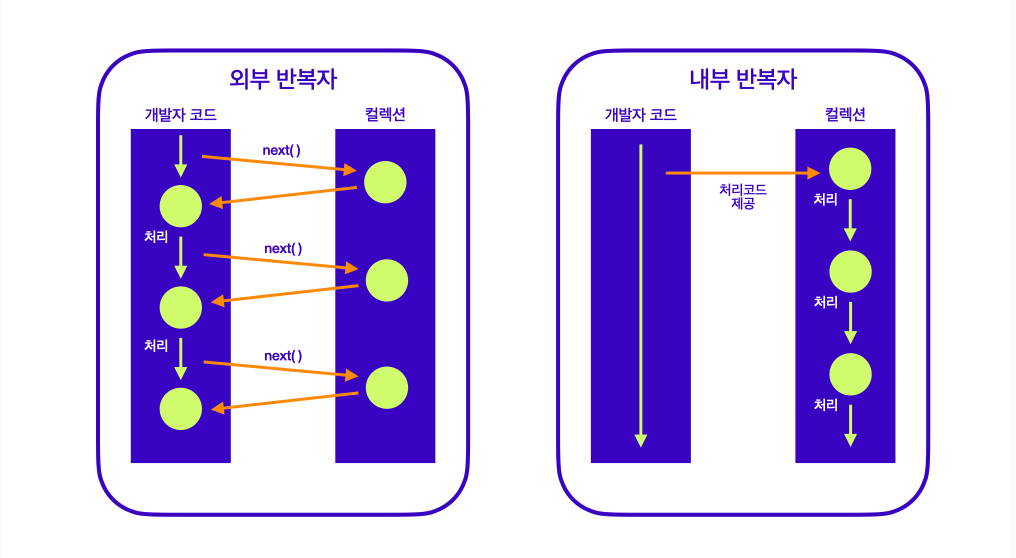 이와는 다르게 내부 반복자는 개발자가 Collection에 요소 처리 코드만 전달할 뿐 Collection 내부에서 모든 데이터를 처리하는 반복자를 의미한다.