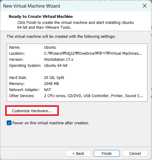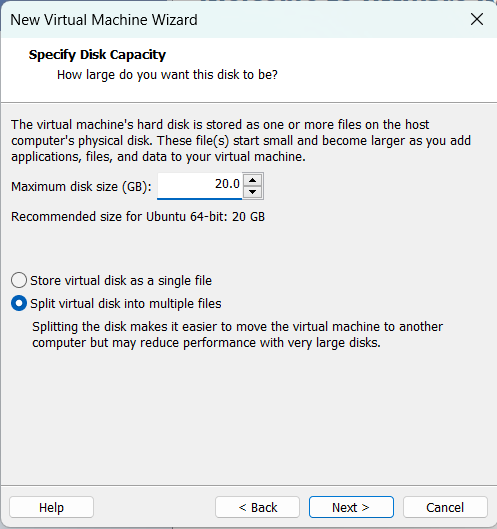 Store virtual disk as a single file과 Split virtual disk into multiple files는 간단히 말하자면 가상 디스크를 쪼갤 것인지 1개로 할 것인지 묻는 건데 이에 대해선 나중에 자세히 알아볼 것이고 지금은 아무거나 선택해도 지장은 없다.