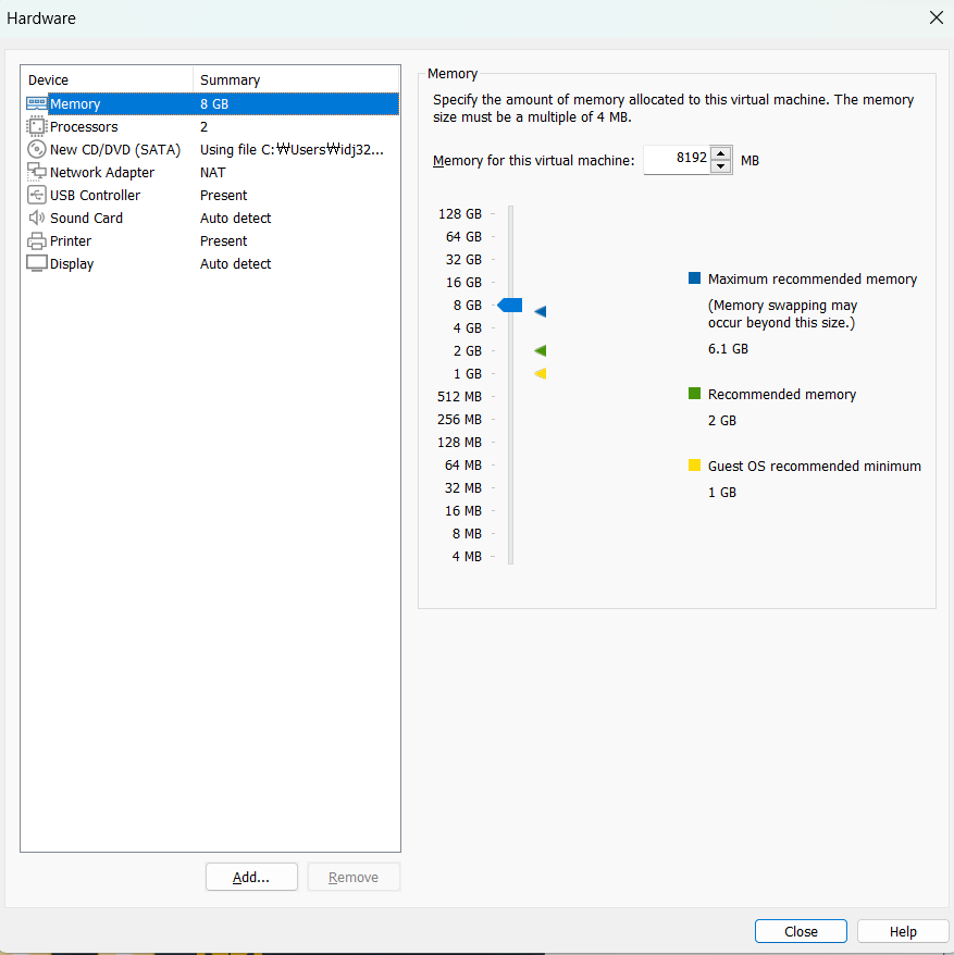 Customize Hardware를 클릭하고 Memory를 2GB에서 8GB로 증가시켜 주자.