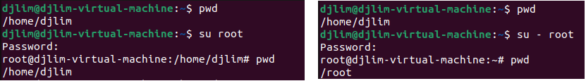 하지만 "su - root" 명령어를 통해 Root 계정으로 로그인할 시 "/root" Directory로 Working Directory가 변경됨을 알 수 있다.