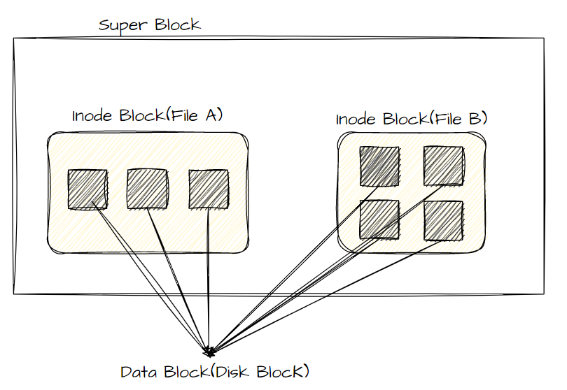 Inode의 기본 구조는 File System을 대표하는 Super Block, 파일의 상세정보를 저장하고 있는 Inode Block, 실제 데이터를 담은 Data Block으로 되어 있다.