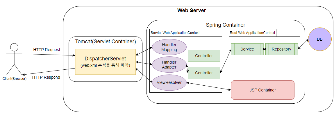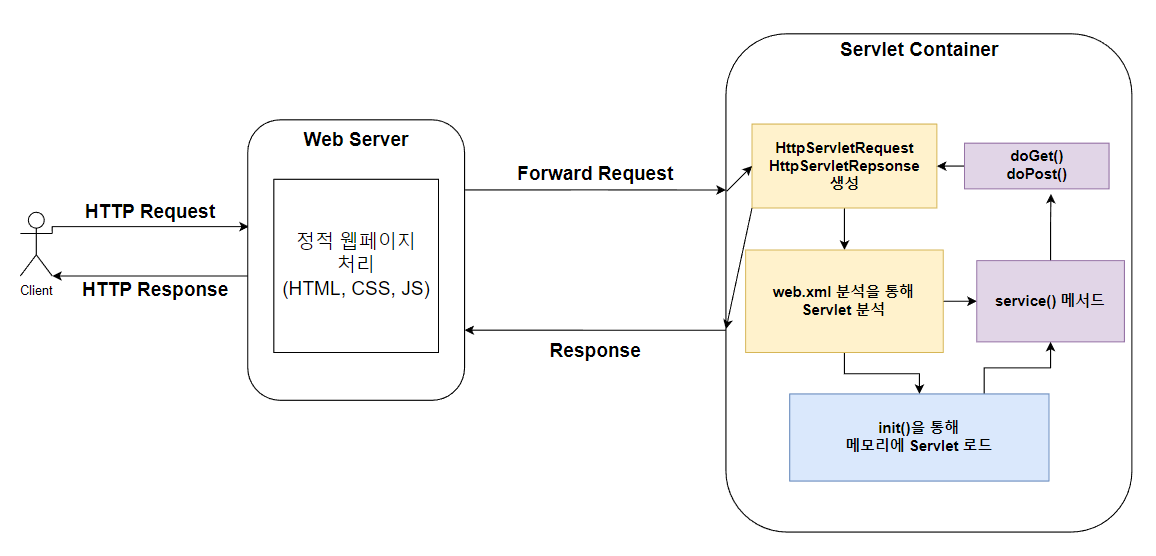 마지막으로 위 이미지 상에는 단계를 조금 더 이해하기 쉽게 하기 위하여 Web Server와 Servlet Container를 나눠두었지만 사실은 Web Server 내부에 Servlet Container가 존재하는 형식이라는 것을 알고 가자.