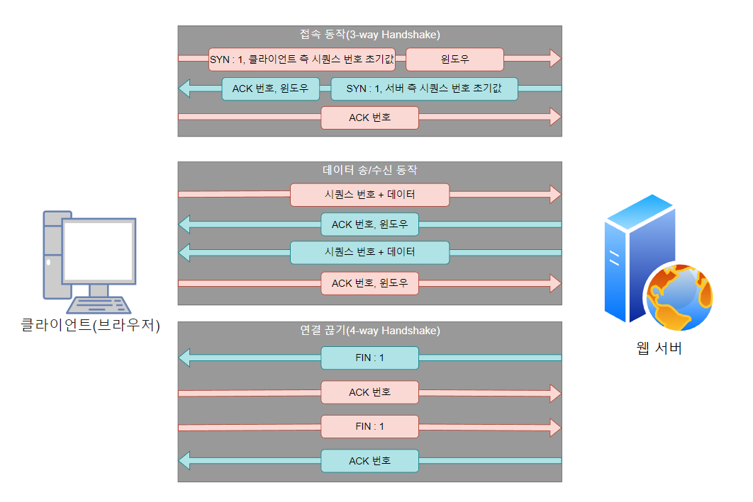 이처럼 연결 동작은 3단계를 거쳐 메시지를 주고받음으로써 클라이언트와 서버 모두 데이터를 송/수신할 준비가 되었다는 것을 안전하게 보장한다.