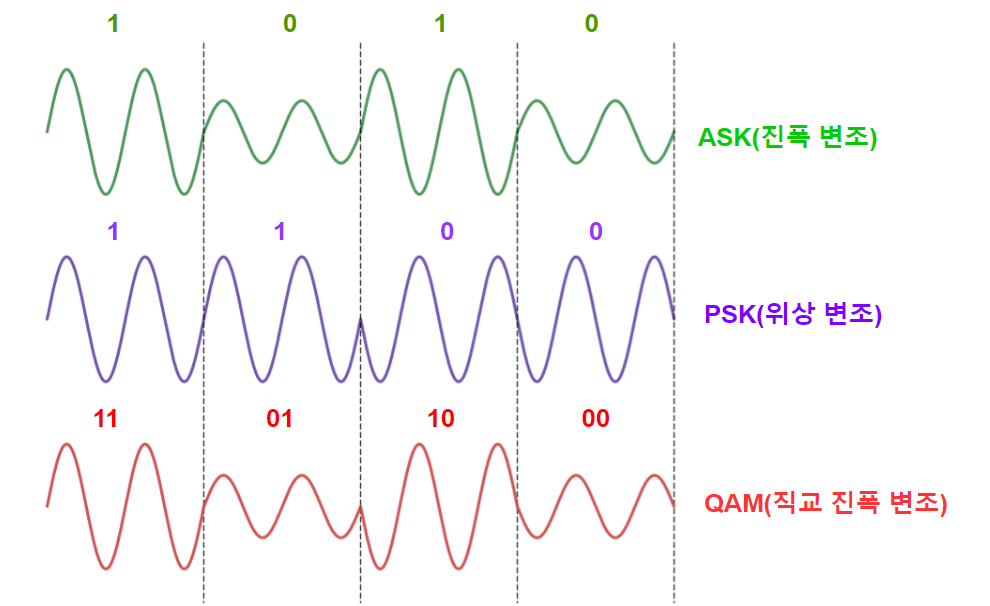 노이즈가 없는 주파수의 파에는 다수의 비트를 대응시켜도 수신 측에서 잘못 해석할 위험성이 적기 때문에 괜찮겠지만 잡음이 있는 주파수의 파에는 다수의 비트를 대응시킬 경우 수신 측에서 잘못 해석할 위험성이 크므로 소수의 비트를 대응시켜야 한다.