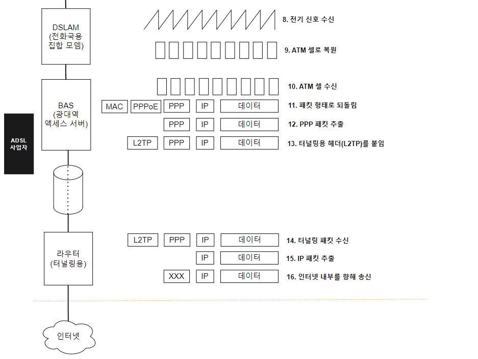 따라서 DSLAM이 준 ATM 셀들을 원래의 이더넷 패킷으로 복원하며 BAS의 수신 동작은 끝난다.