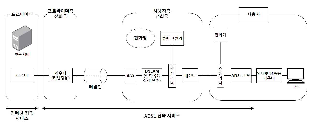 ADSL 기술을 사용한 액세스 회선은 위 이미지와 같은 구성도를 가진다.