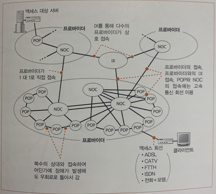 인터넷은 1개의 조직이 운영 관리하는 단일 네트워크가 아니라 다수의 프로바이더의 네트워크를 서로 접속시켜 구성한 시스템이다.