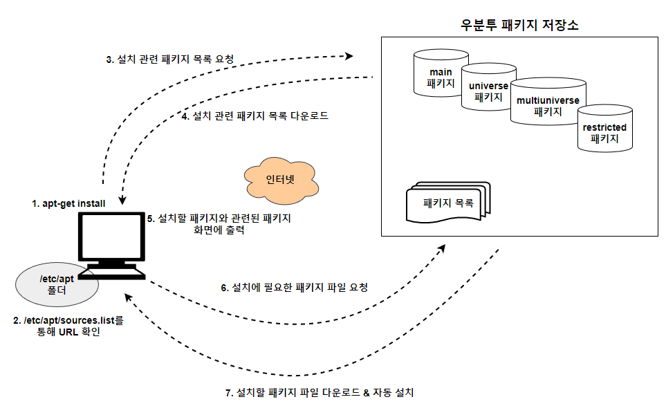 apt-get은 위 이미지와 같이 동작한다. 여기에서 중요한 점이 "/etc/apt/sources.list"이다.