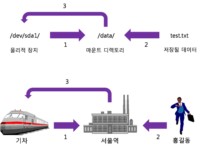 물리적 장치 = 기차, 마운트 디렉터리(하드웨어와 연결된 디렉터리) = 서울역, 데이터 = 홍길동이다.