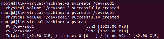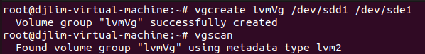 필자는 "lvmVg"라는 VG를 "/dev/sdd1"과 "/dev/sde1" PV를 통해 만들 것이다.