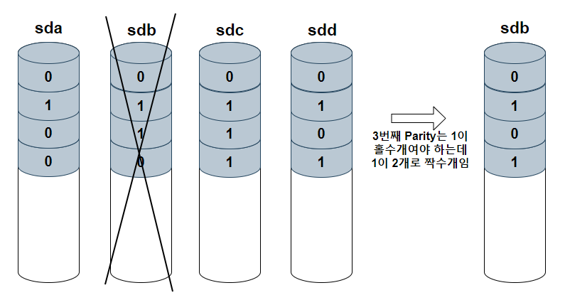 RAID 5는 "패리티(Parity)"라는 것을 활용하여 데이터를 복구한다.
