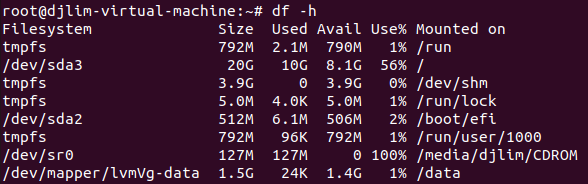 우리는 1GB짜리 하드디스크 2개를 합쳤지만 LVM에 의해 /dev/lvmVg/data에 1.5GB가 할당되었음을 알 수 있다.