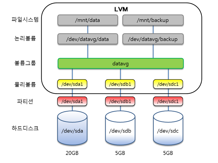 - Physical Volume : 실제 하드디스크를 통해 설정한 파티션(ex. /dev/sda1, /dev/sdb1 등)