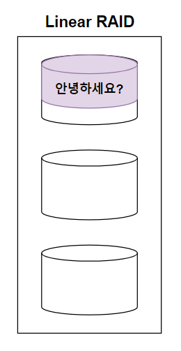 앞 디스크부터 차례로 저장하는 RAID 방식인데, 단순히 여러 개의 하드디스크를 1개의 볼륨으로 묶었을 뿐 특별한 로직은 존재하지 않는다.