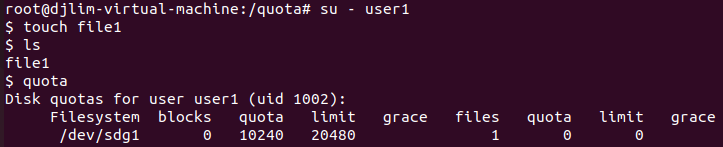 이후 파일 하나를 만들어준 뒤 "quota" 명령어를 통해 디스크 쿼터 설정이 제대로 적용되었는지 확인해 보자.