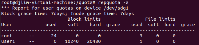 혹시 모르니 다시 root 계정으로 접속한 뒤 "repquota -a" 명령을 통해 설정이 제대로 적용되었는지 확인해 보자.