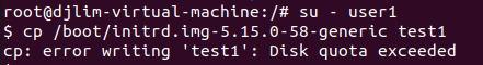 "Disk quota exceeded". 즉 설정한 디스크 할당량을 넘긴 파일을 저장하려 했으므로 파일을 복사하지 못했음을 확인할 수 있다.