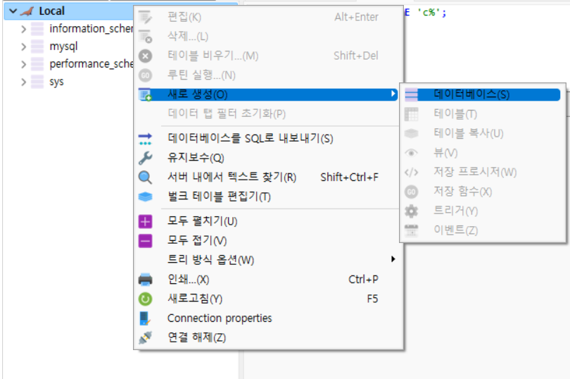 Local이름의 가장 상위 디렉터리에 대해 마우스 오른쪽 클릭을 하고 위 사진처럼 클릭하면 Database를 생성할 수 있다.