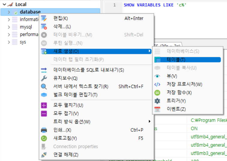 Table을 생성하고 싶은 Database를 클릭하고 마우스 오른쪽을 클릭하면 위와 같은 형식으로 테이블을 만들 수 있다.