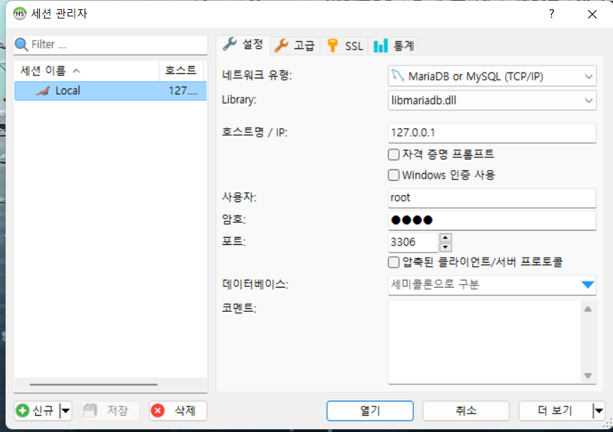 이후 열기를 선택하면 내가 접속할 DB를 GUI 형태로 볼 수 있다.
