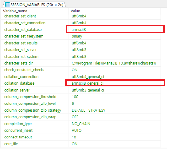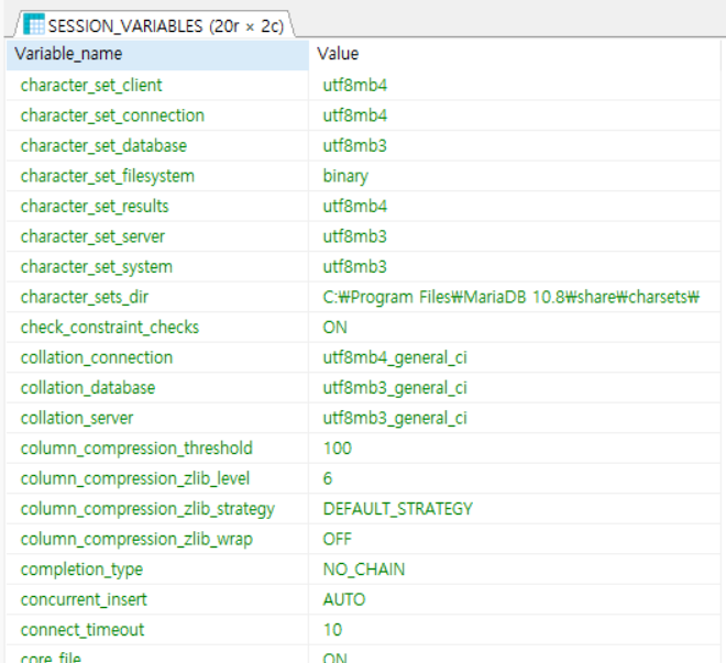 Variabes 중에서 c로 시작하는 모든 Variable을 검색하는 건데, 사실상 Character와 Collation이 조건을 만족하는 Variables 대부분을 차지하므로 위처럼 검색한다. 만약 아래 사진과 같이 utf8, 혹은 utf8mb4가 아닌 다른 값이 character_set이나 collation으로 시작하는 Variables의 Value로 들어가 있다면 Character Set이 문제인 것이 확실해지는 것이다