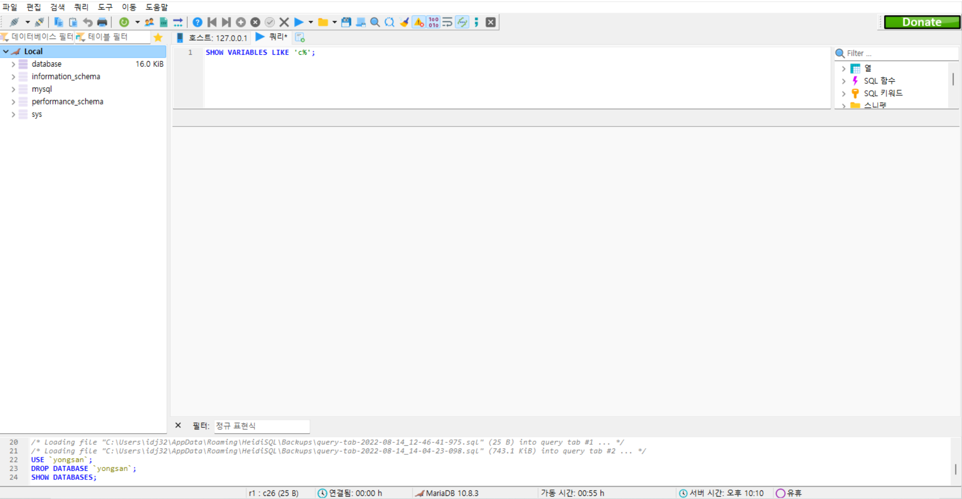 먼저 왼쪽에 Local 아래 있는 것들이 DB를 의미한다. 즉 현재 Loca의 MariaDB 서버에는 database, information_schema, mysql, performance_schema, sys라는 DataBase가 존재하는 것이다.