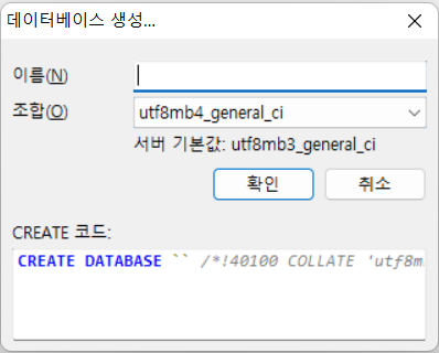 그리고 여기서 "utf8mb4_general_ci", 혹은 utf8이 포함된 general_ci 조합을 선택해야 이후 추가 설정 없이도 한글을 활용할 수 있다.