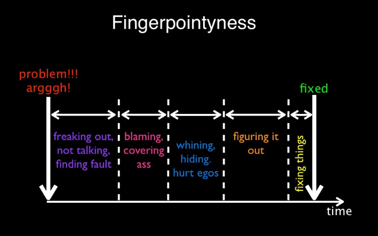 이렇다 보니 만약 문제가 발생했을 경우 서로 자기 분야의 문제가 아니라며 다른 팀에게 책임을 미루면서 문제 해결이 지연될 수 있다. 이런 서로 책임을 떠넘기며 문제 해결이 지연되는 현상을 Fingerpointyness라고 한다.