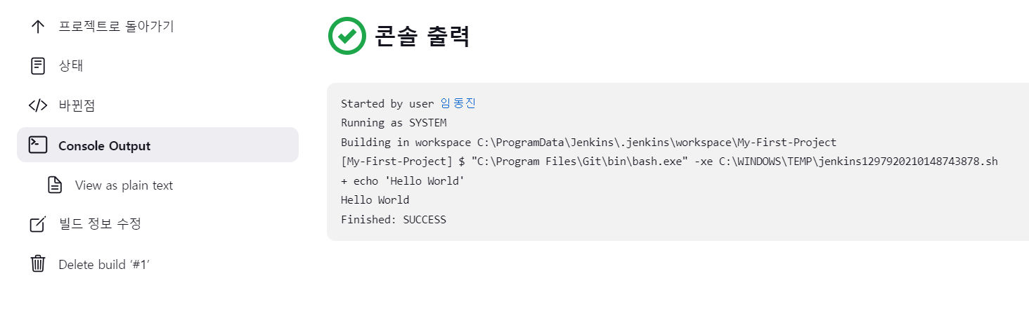 하지만 아까 3-2 단계에서 Build하는 과정에 echo "Hello World"라는 Script 명령이 수행되도록 설정했다.