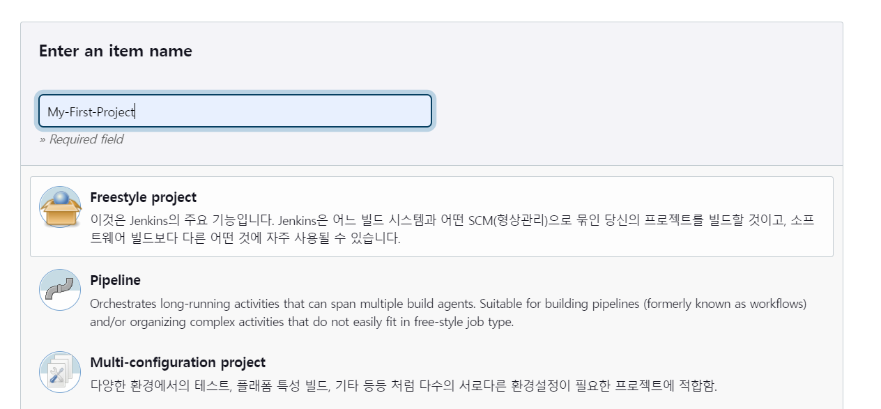 아래에도 여러 가지 Template도 있는데, 이를 활용하기 위해선 추가적인 Plugin이 필요하기 때문에 일단 Freestyle project로 생성한다.