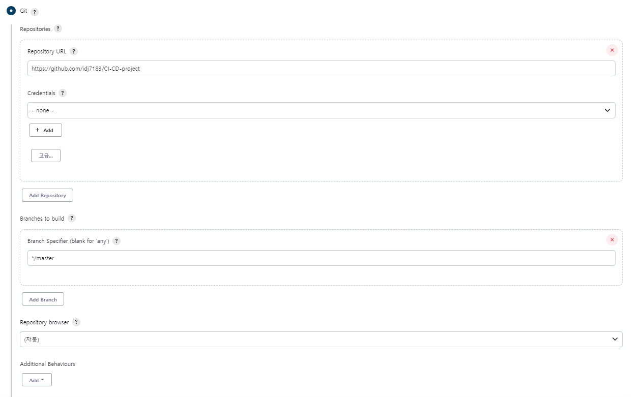 GitHub와 연동하기 위한 단계이다. 이 Section에서 GitHub의 브랜치 중 트리거로 삼을 브랜치를 선택할 수 있으며 어떤 GitHub 프로젝트를 자동으로 빌드할지 등에 대한 설정을 할 수 있다.