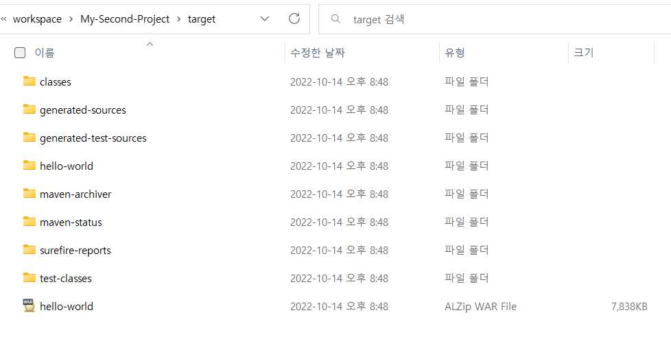 처음 Project와는 다르게 이번 Maven Project에서는 Source Code를 바탕으로 war 형식으로 Packaging 과정을 수행하였다. 당연히 Packaing의 결과인 war 파일이 존재해야 할 것이다.