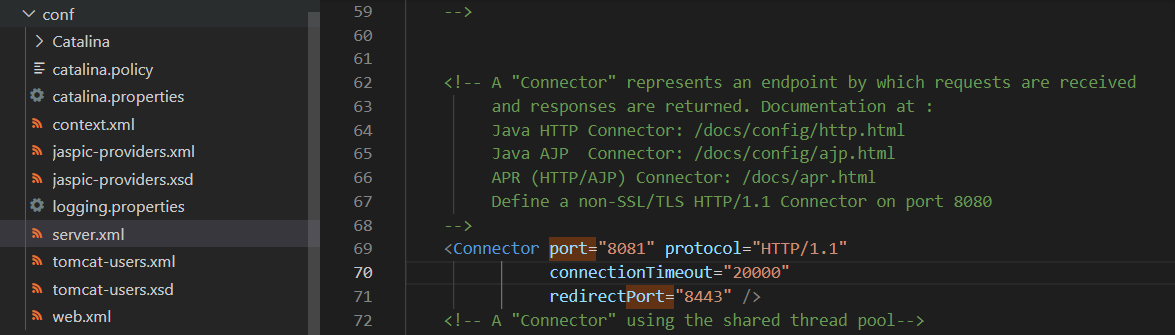 - conf : Tomcat의 각종 설정과 관련된 디렉터리