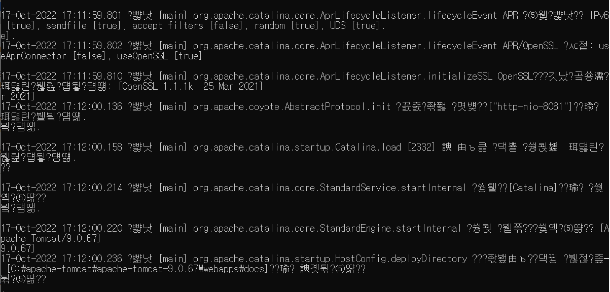 Tomcat을 실행하려고 startup.bat을 실행시키면 대부분의 경우 이렇게 한글이 깨져 나올 것이다.