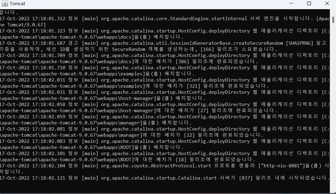 또한 로그 중에서는 Tomacat 구동 시간 등 성능에 관련된 기록들도 몇 개 존재하므로 이왕이면 한글 깨짐 현상을 해결하고 가는 것이 좋다.