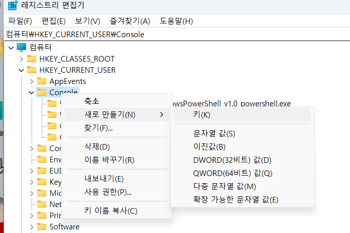 2. HKEY_CURRENT_USER > Console > Tomcat 폴더 생성