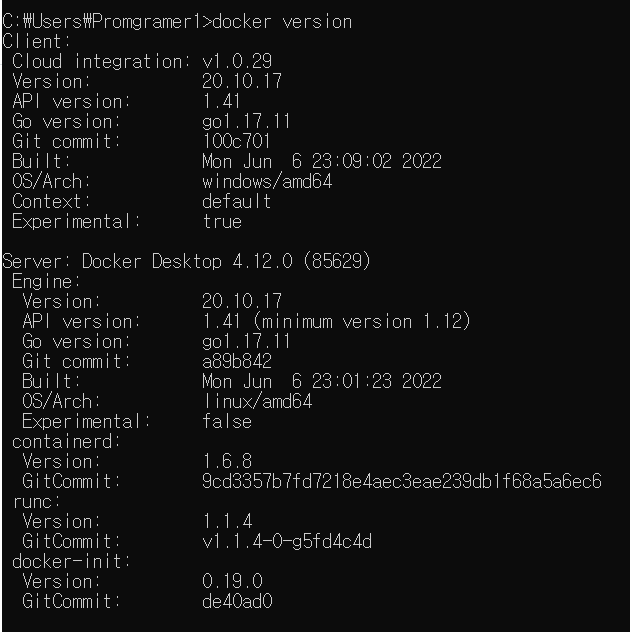 Docker Server는 Docker Daemon을 가지고 있으면서 Client 측에서 온 명령문을 직접 실행한다. 우리는 Docker Desktop이 동작할 때 가상화된 Linux 서버 위에서 동작함을 알고 있다. 즉, CMD를 통해 입력한 명령문이 직접 실행되는 환경은 Linux 위에 존재하는 Docker Deamon이므로 OS를 보면 linux/amd64라고 기입된 것을 볼 수 있다.